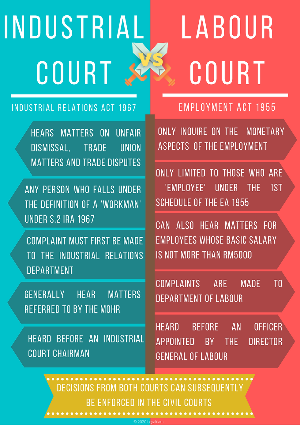 On the other hand, the Industrial Court functions under the purview of the Industrial Relations Act 1967 (“IRA 1967”). The Industrial Court does not sit in the traditional capacity of the civil courts but rather as a special entity set up to hear matters pertaining to workman, employers and trade unions permitting specific performances such as reinstatement to be awarded.
